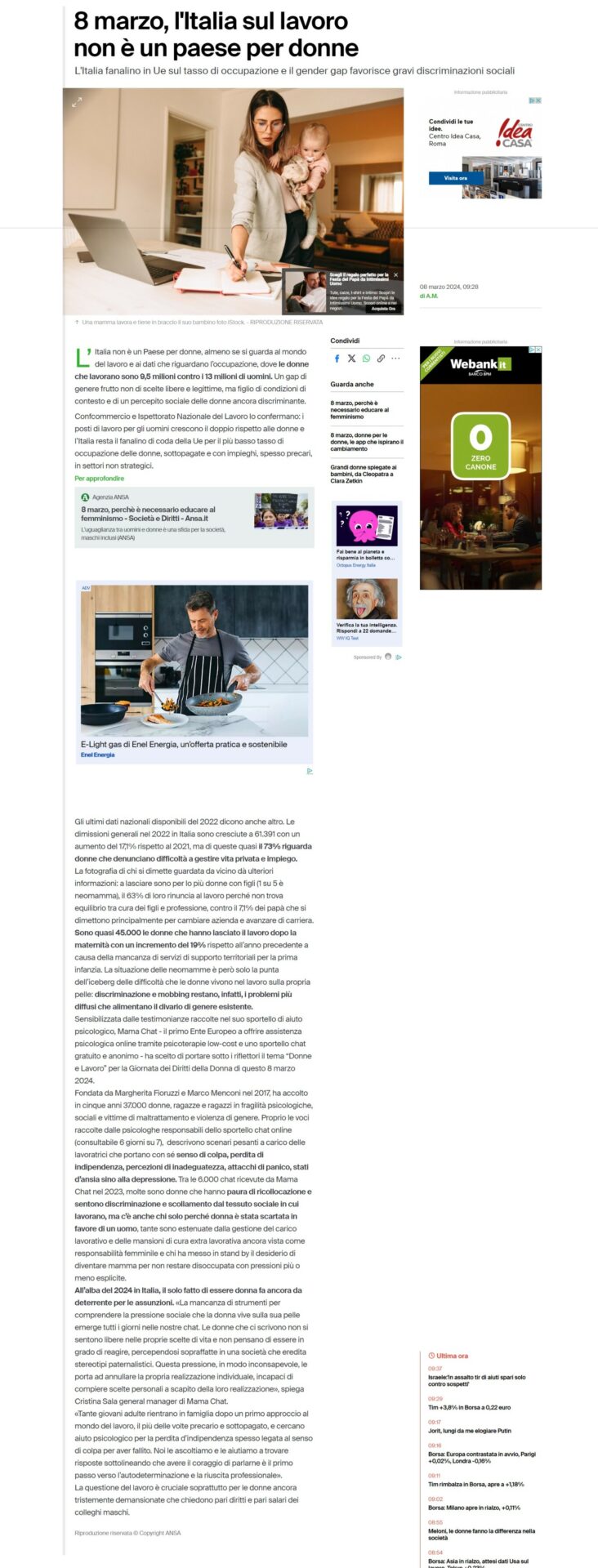 8 Marzo, l’Italia sul lavoro non è un paese per donne Pubblicato il08/03/2024 Leggi l’Articolo completo 8 marzo, l’Italia sul lavoro non è un paese per donne – Società e Diritti – Ansa.it
