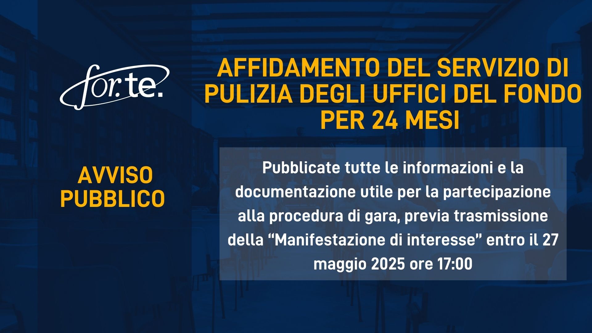 Si comunica che nella sezione Amministrazione trasparente > Avvisi pubblici e bandi di gara sono disponibili, in pagina dedicata, tutte le informazioni utili per poter partecipare alla procedura negoziata senza bando, ai sensi dell’art. 50, comma 1, lett. e) del D.lgs. 36/2023, concernente l’affidamento del servizio di pulizia degli uffici del Fondo For.Te., per la durata di 24 mesi, salvo opzione di proroga per ulteriori 12 mesi, eventualmente attivabile da parte del Fondo.