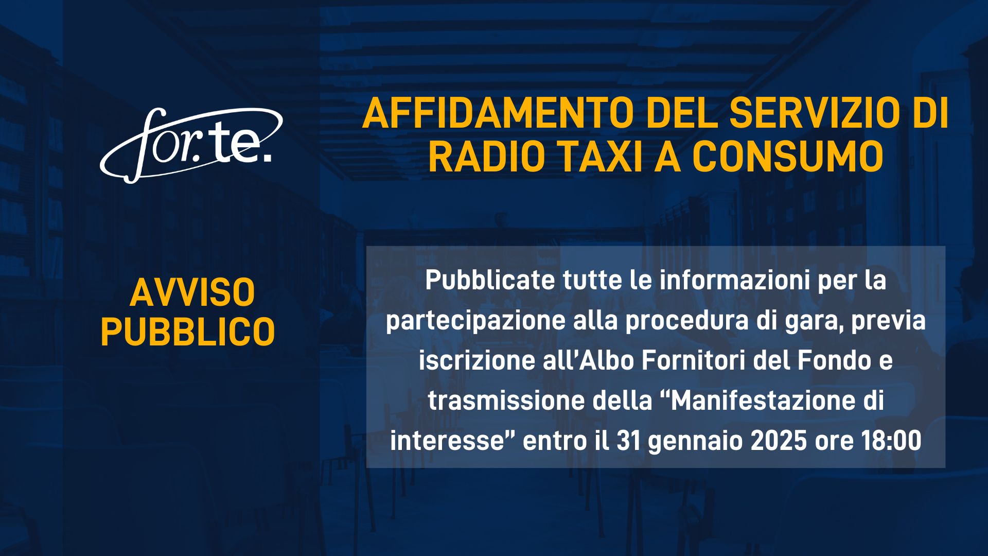 Si comunica che nella sezione Amministrazione trasparente > Avvisi pubblici e bandi di gara sono disponibili, in pagina dedicata, tutte le informazioni utili per poter partecipare alla procedura di gara relativa all’affidamento diretto, ai sensi dell’Art. 50, comma 1, lett. b), del D.lgs. 36/2023, del servizio di Radio Taxi a consumo a favore di Fondo For.Te., per la durata di 36 (trentasei) mesi.