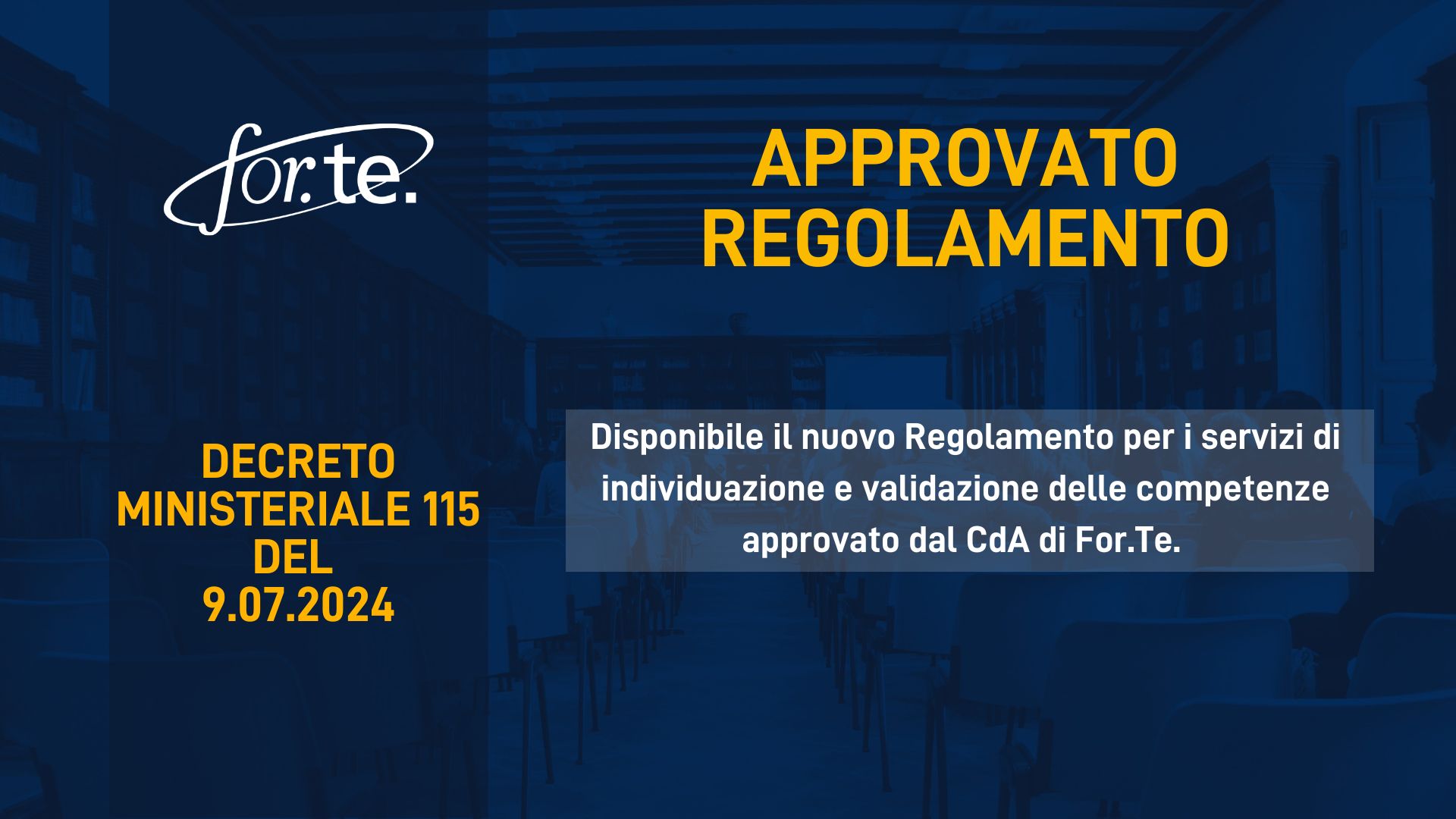 Approvato dal Consiglio di Amministrazione di For.Te. nella seduta del 21 maggio 2025, il Regolamento per i servizi di individuazione e di validazione delle competenze, in attuazione del Decreto Ministeriale n. 115 del 9 luglio 2024.