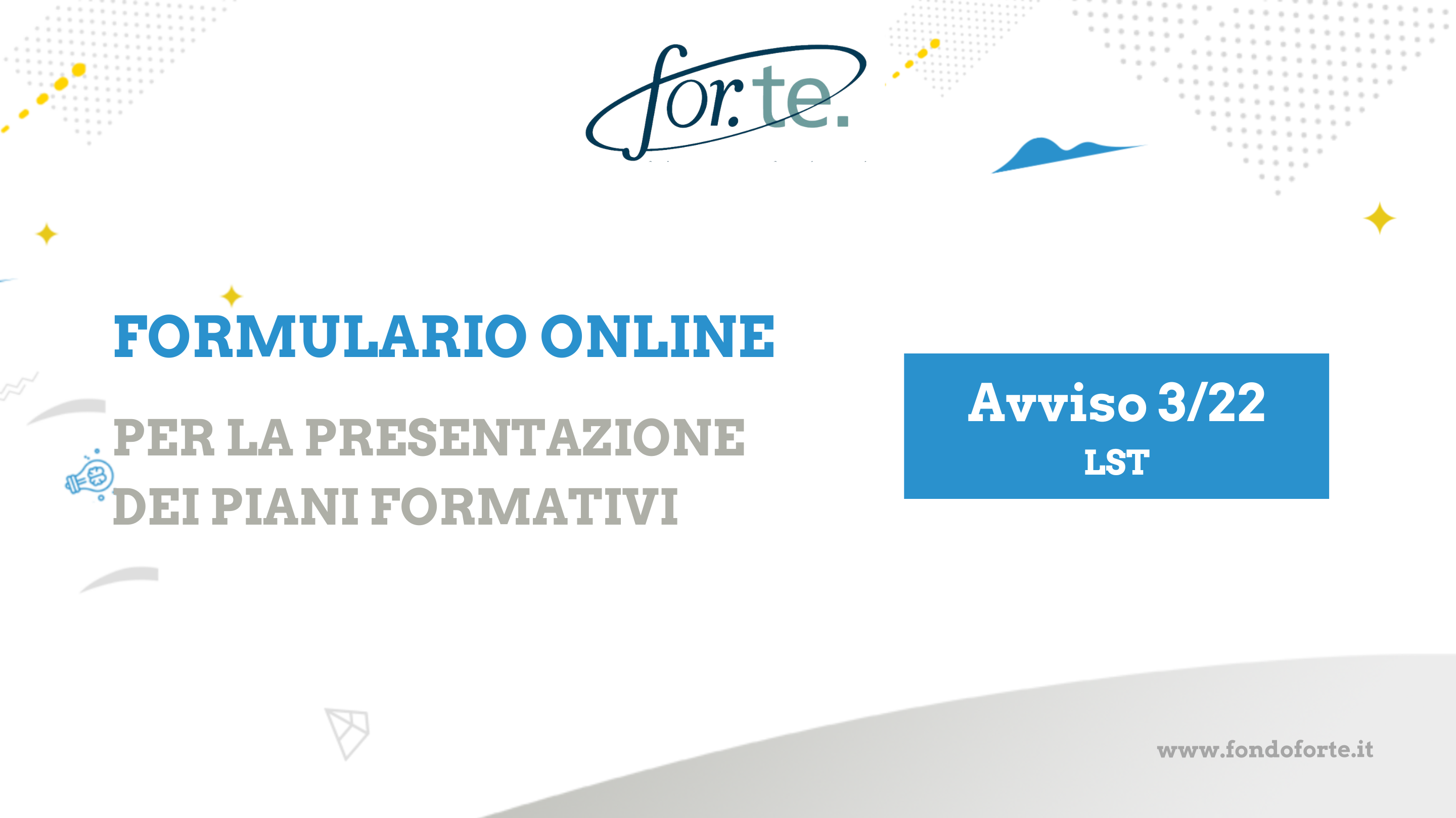 A partire dalle ore 9.00 di domani 7 ottobre 2022, accedendo all’Area Riservata del sito web del Fondo, sarà disponibile il Formulario on-line relativo all’Avviso 3/22, dedicato ai settori Logistica, Spedizioni, Trasporti.