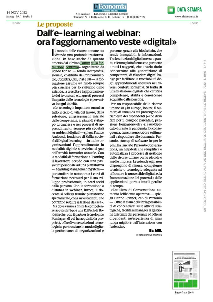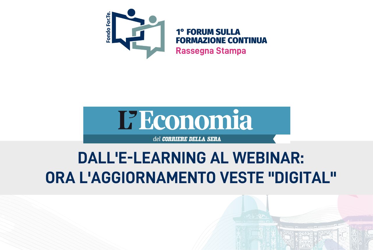 Dall’e-learning al webinar: ora l’aggiornamento veste “digital” Pubblicato il14/11/2022 L’Economia del Corriere della Sera – 14 Novembre Formazione cruciale per PMI e lavoratori 05/10/202301/12/2023 Formazione, dote da 1 miliardo. Al centro le competenze digitali 07/12/202201/12/2023 Ripensare la formazione continua in un mondo che cambia 06/12/202201/12/2023 Formazione Continua, la visione di Fondo For.Te. 06/12/202201/12/2023 Qualità garantita con rating, performance e tecnologia 29/11/202201/12/2023 Dossier Formazione Continua – Digitale e ambiente, la transizione è il pilastro della Formazione Continua 29/11/202201/12/2023