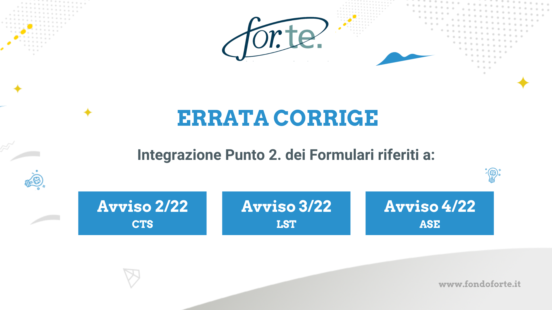 ERRATA CORRIGE: Integrazione Formulari Avvisi 2/22 CTS, 3/22 LST, 4/22 ASE