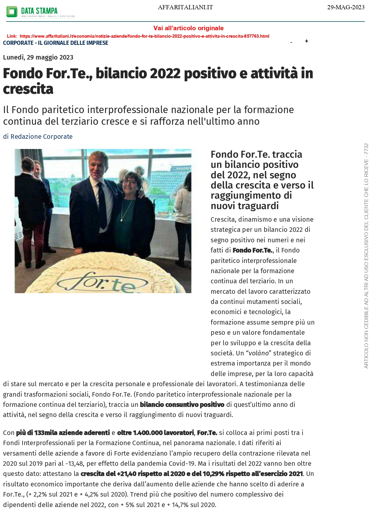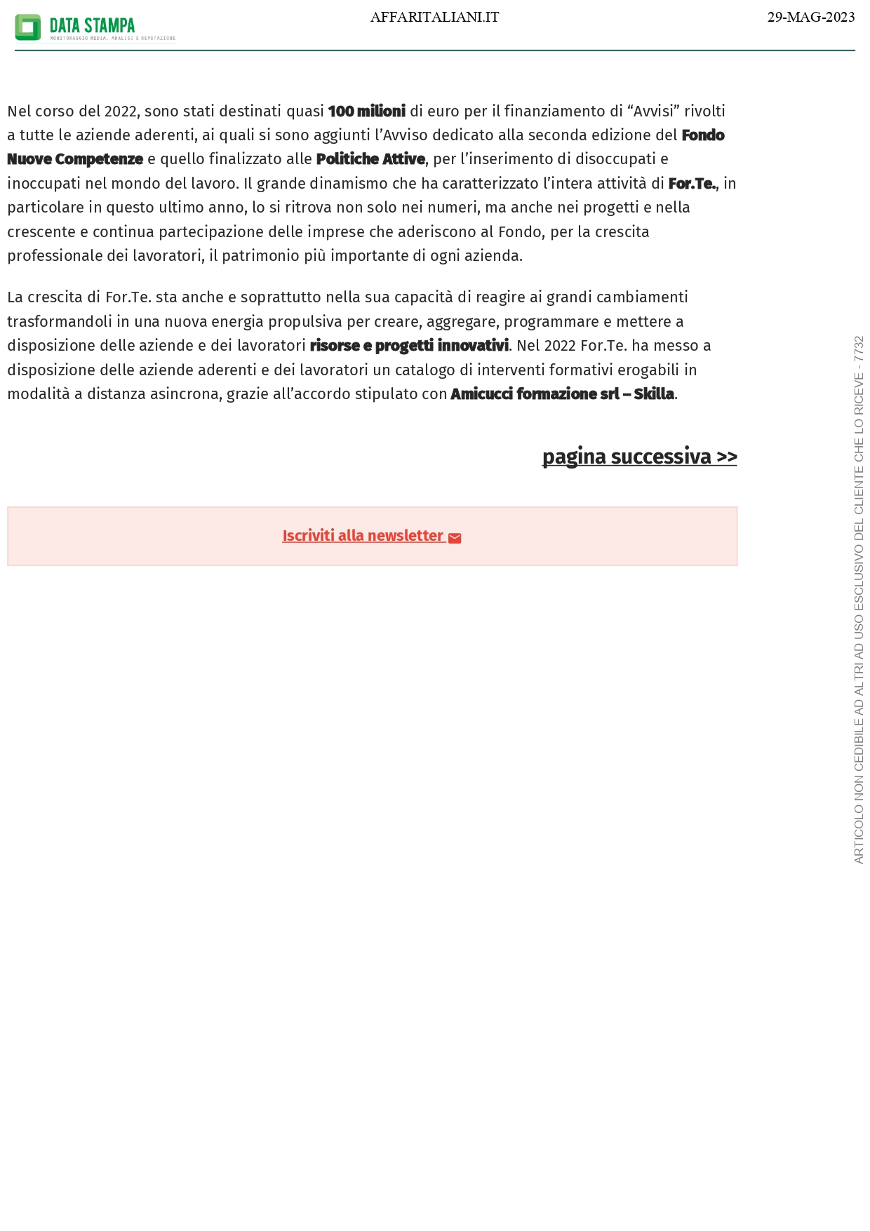 Fondo For.Te., bilancio 2022 positivo e attività in crescita Pubblicato il29/05/2023 Affari Italiani – 29 Maggio 2023 Formazione cruciale per PMI e lavoratori 05/10/202301/12/2023 Formazione, dote da 1 miliardo. Al centro le competenze digitali 07/12/202201/12/2023 Ripensare la formazione continua in un mondo che cambia 06/12/202201/12/2023 Formazione Continua, la visione di Fondo For.Te. 06/12/202201/12/2023 Qualità garantita con rating, performance e tecnologia 29/11/202201/12/2023 Dossier Formazione Continua – Digitale e ambiente, la transizione è il pilastro della Formazione Continua 29/11/202201/12/2023