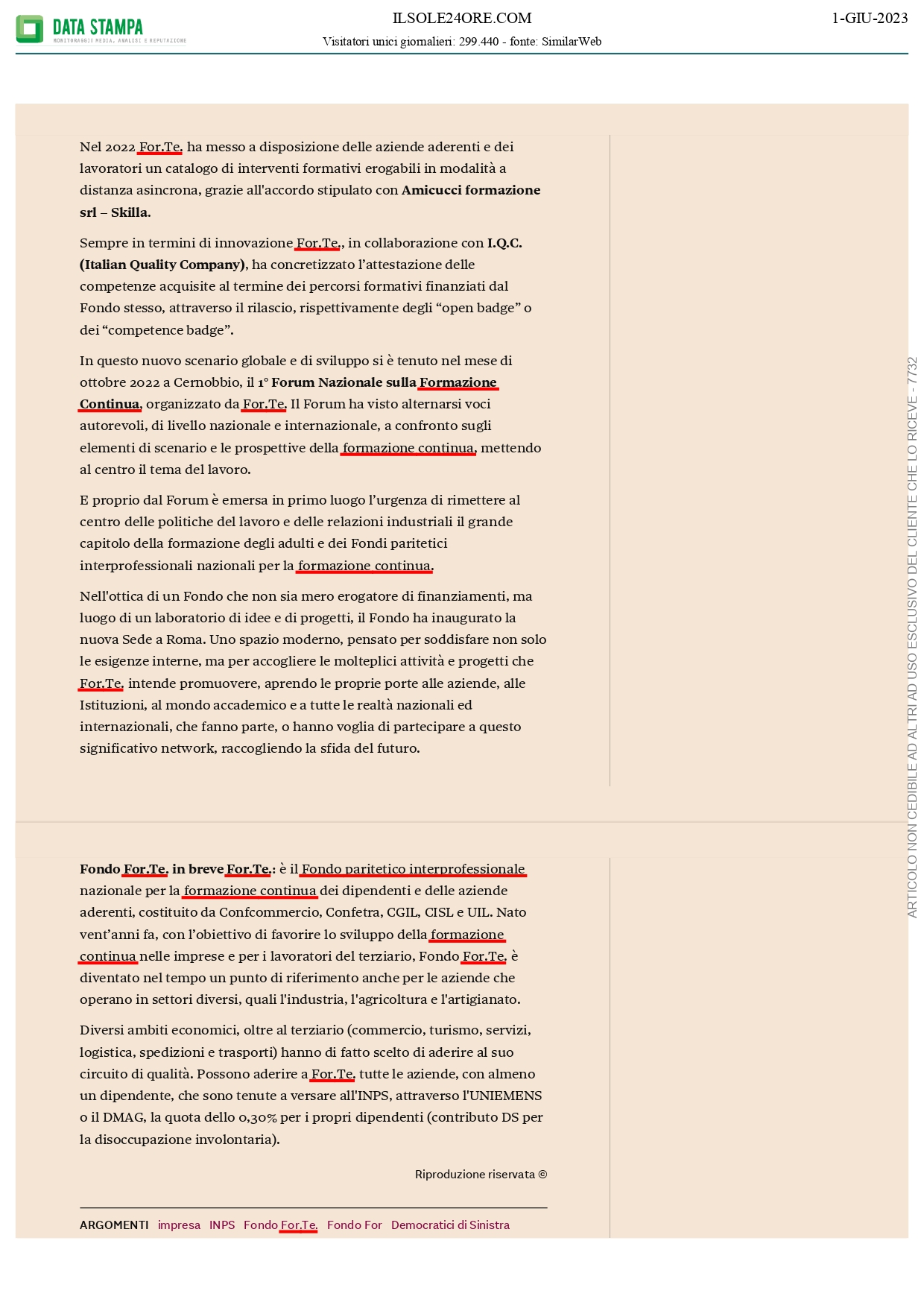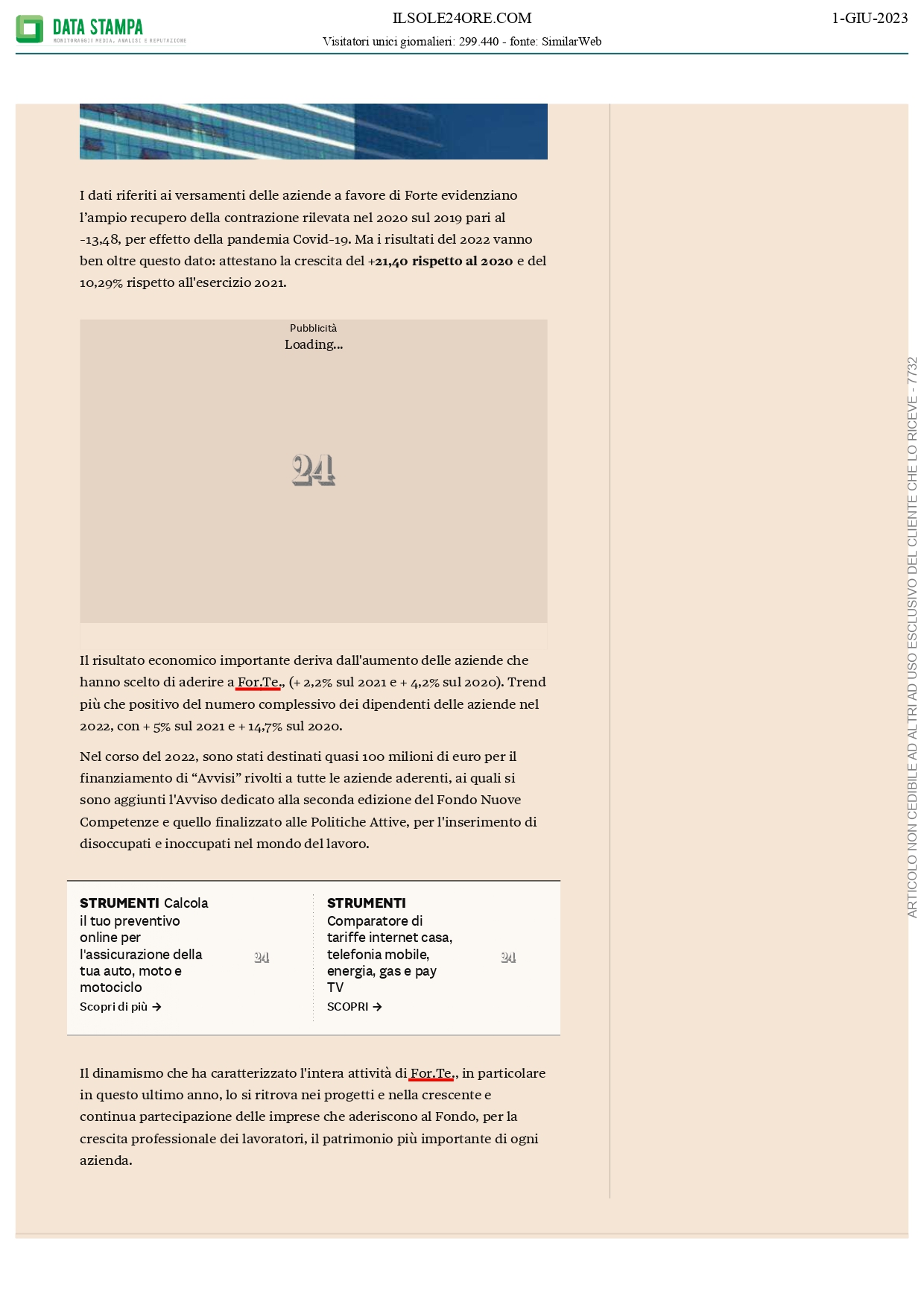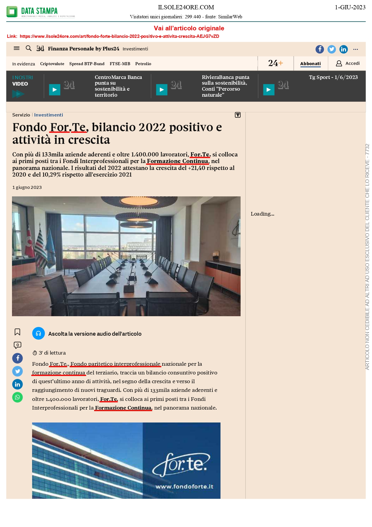 Fondo For.Te., bilancio 2022 positivo e attività in crescita Pubblicato il01/06/2023 Il Sole 24 Ore – 1 Giugno 2023 Formazione cruciale per PMI e lavoratori 05/10/202301/12/2023 Formazione, dote da 1 miliardo. Al centro le competenze digitali 07/12/202201/12/2023 Ripensare la formazione continua in un mondo che cambia 06/12/202201/12/2023 Formazione Continua, la visione di Fondo For.Te. 06/12/202201/12/2023 Qualità garantita con rating, performance e tecnologia 29/11/202201/12/2023 Dossier Formazione Continua – Digitale e ambiente, la transizione è il pilastro della Formazione Continua 29/11/202201/12/2023