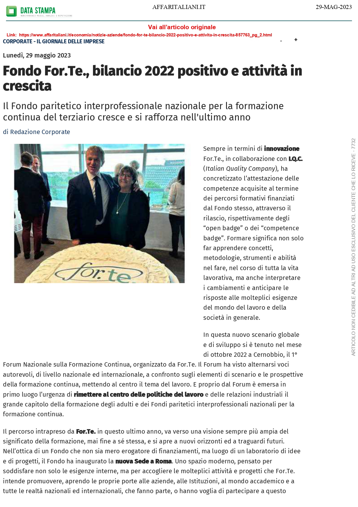 Fondo For.Te., bilancio 2022 positivo e attività in crescita Pubblicato il29/05/2023 Affari Italiani – 29 Maggio 2023 Formazione cruciale per PMI e lavoratori 05/10/202301/12/2023 Formazione, dote da 1 miliardo. Al centro le competenze digitali 07/12/202201/12/2023 Ripensare la formazione continua in un mondo che cambia 06/12/202201/12/2023 Formazione Continua, la visione di Fondo For.Te. 06/12/202201/12/2023 Qualità garantita con rating, performance e tecnologia 29/11/202201/12/2023 Dossier Formazione Continua – Digitale e ambiente, la transizione è il pilastro della Formazione Continua 29/11/202201/12/2023