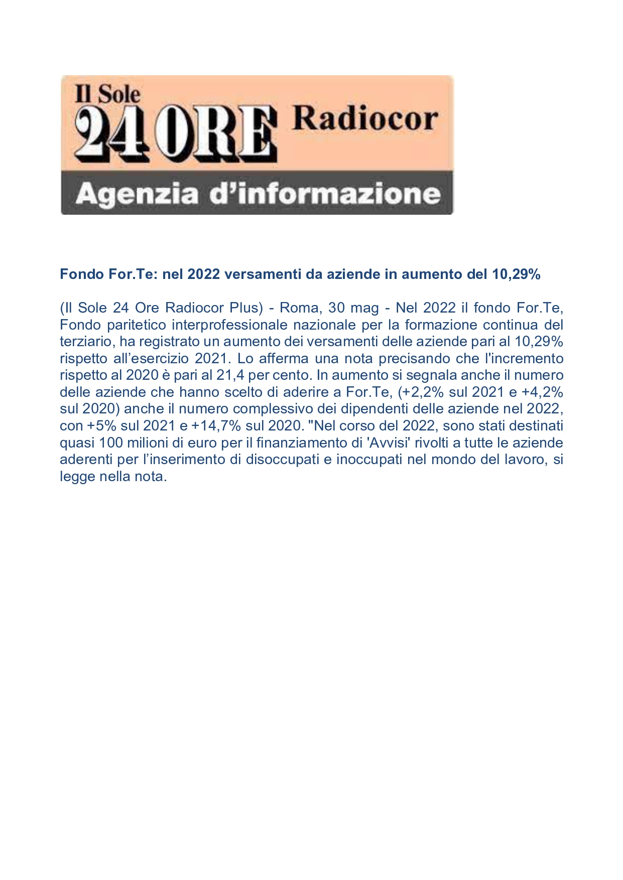 Fondo For.Te., nel 2022 versamenti da aziende in aumento del 10,29% Pubblicato il30/05/2023 Ansa – 29 Maggio 2023 Formazione cruciale per PMI e lavoratori 05/10/202301/12/2023 Formazione, dote da 1 miliardo. Al centro le competenze digitali 07/12/202201/12/2023 Ripensare la formazione continua in un mondo che cambia 06/12/202201/12/2023 Formazione Continua, la visione di Fondo For.Te. 06/12/202201/12/2023 Qualità garantita con rating, performance e tecnologia 29/11/202201/12/2023 Dossier Formazione Continua – Digitale e ambiente, la transizione è il pilastro della Formazione Continua 29/11/202201/12/2023
