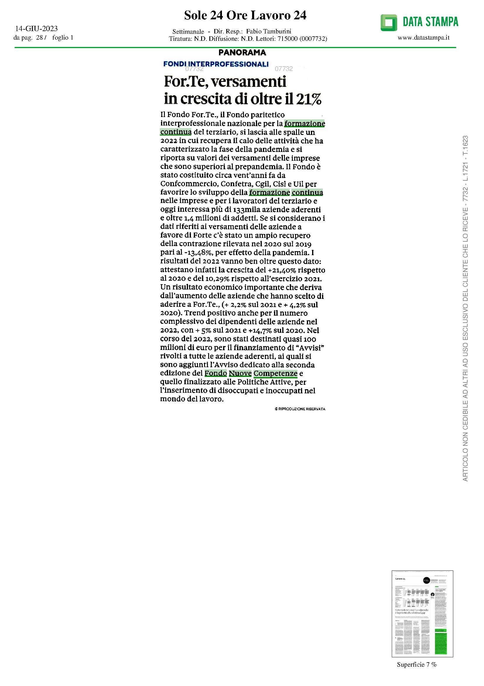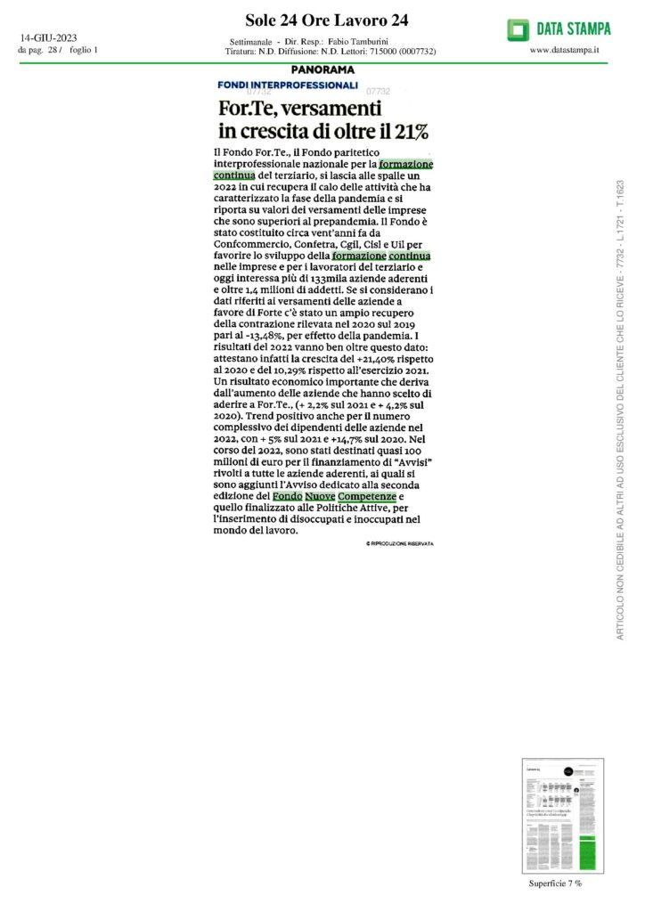 For.Te.,versamenti in crescita di oltre il 21% Pubblicato il14/06/2023 Il Sole 24 Ore – 14 Giugno 2023 Formazione cruciale per PMI e lavoratori 05/10/202301/12/2023 Formazione, dote da 1 miliardo. Al centro le competenze digitali 07/12/202201/12/2023 Ripensare la formazione continua in un mondo che cambia 06/12/202201/12/2023 Formazione Continua, la visione di Fondo For.Te. 06/12/202201/12/2023 Qualità garantita con rating, performance e tecnologia 29/11/202201/12/2023 Dossier Formazione Continua – Digitale e ambiente, la transizione è il pilastro della Formazione Continua 29/11/202201/12/2023