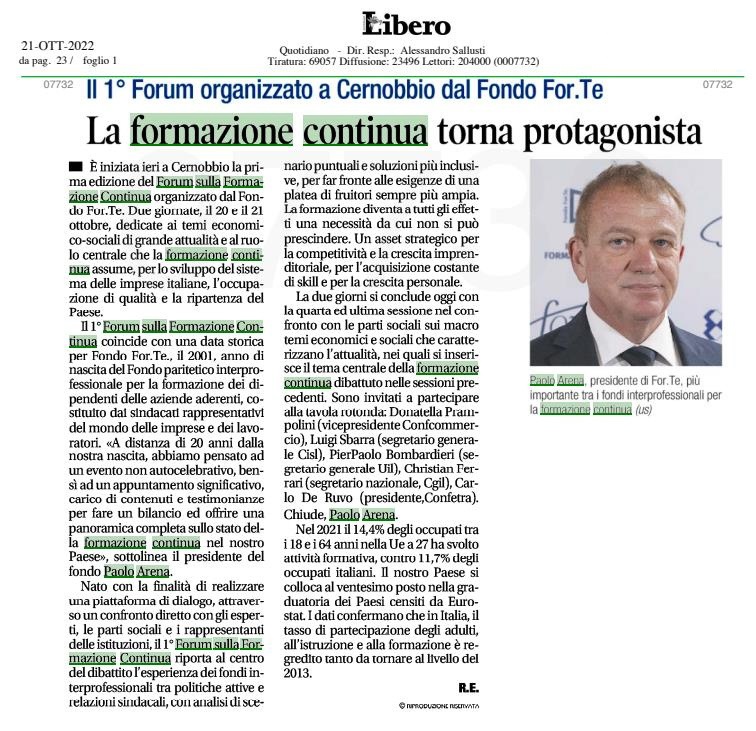 La formazione continua torna protagonista Pubblicato il21/10/2022 Il 1° Forum organizzato a Cernobbio da Fondo For.Te. Allegato Libero – 21 Ottobre Nessun articolo