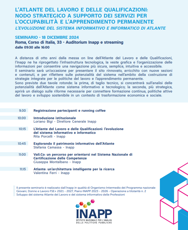 Dopo otto anni dalla sua pubblicazione online, l’INAPP ha rinnovato l’Atlante del Lavoro e delle Qualificazioni, aggiornandone l’infrastruttura tecnologica, l’interfaccia grafica e l’organizzazione delle informazioni per una navigazione più accessibile. Il seminario al quale ha preso parte Fondo For.Te. ha presentato queste innovazioni, evidenziando come l’Atlante sia una mappa dettagliata del lavoro e delle qualificazioni nazionali, in grado di fornire un linguaggio comune tra Istituzioni, Fondi Interprofessionali, imprese e cittadini nella pianificazione delle attività formative e nel monitoraggio delle competenze richieste dal mercato.