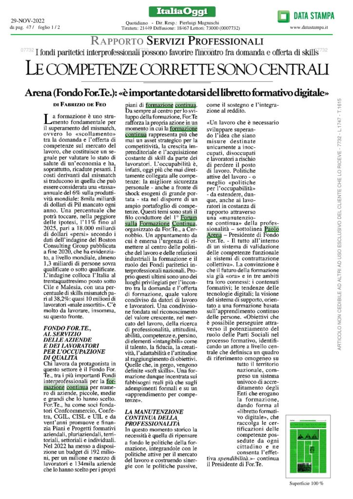 Le Competenze Corrette Sono Centrali Pubblicato il29/11/2022 ItaliaOggi – 29 Novembre Formazione cruciale per PMI e lavoratori 05/10/202301/12/2023 Formazione, dote da 1 miliardo. Al centro le competenze digitali 07/12/202201/12/2023 Ripensare la formazione continua in un mondo che cambia 06/12/202201/12/2023 Formazione Continua, la visione di Fondo For.Te. 06/12/202201/12/2023 Qualità garantita con rating, performance e tecnologia 29/11/202201/12/2023 Dossier Formazione Continua – Digitale e ambiente, la transizione è il pilastro della Formazione Continua 29/11/202201/12/2023