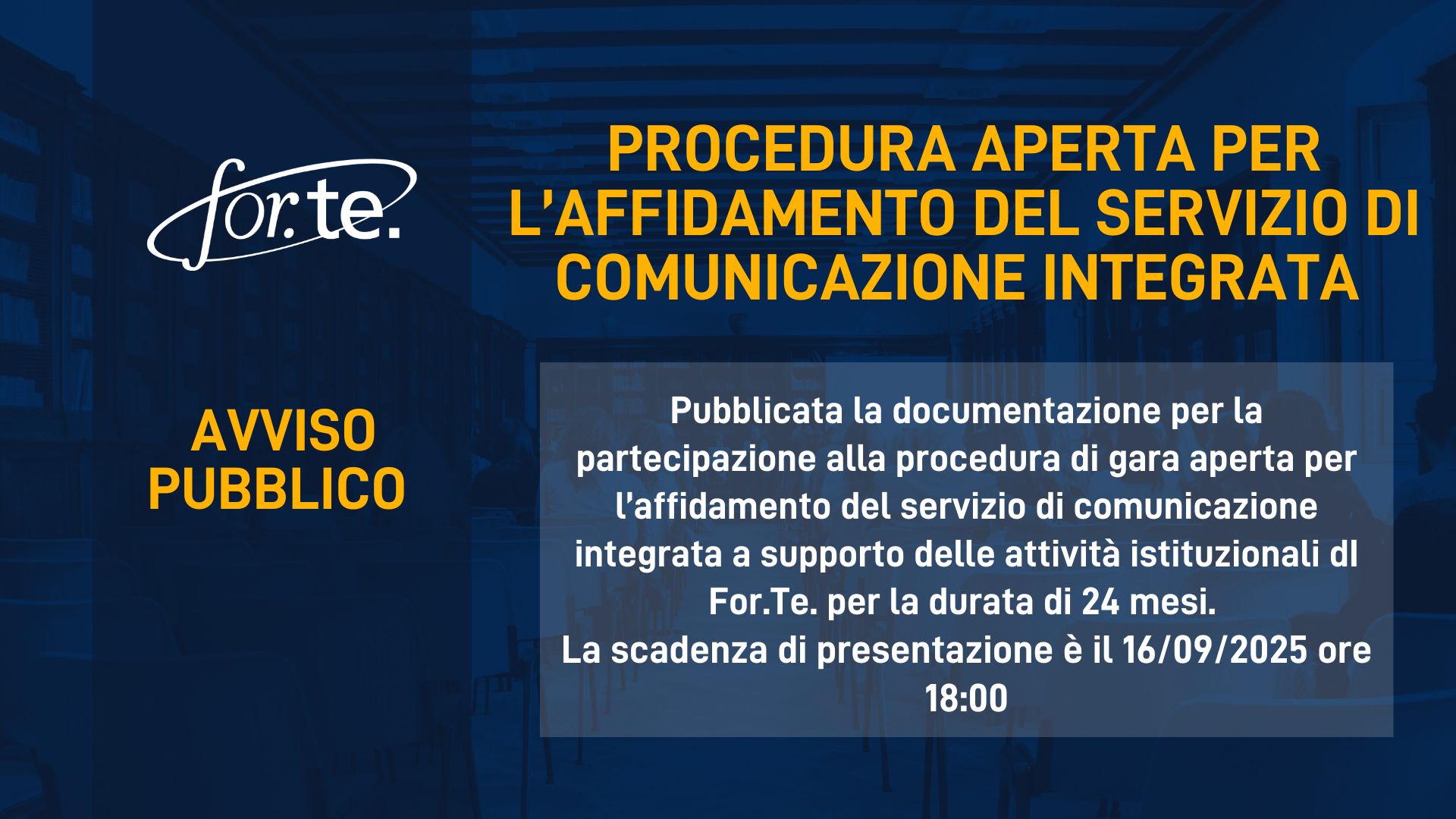 Si comunica che nella sezione Amministrazione trasparente > Avvisi pubblici e bandi di gara è disponibile, in pagina dedicata, il Bando di gara e la documentazione associata relativa alla procedura di gara aperta, ai sensi dell’art. 71 del D.lgs. 36/2023 e ss.mm.ii., a Lotto unico, per l’affidamento del servizio di comunicazione integrata a supporto delle attività istituzionali del Fondo For.Te., per la durata di 24 (ventiquattro) mesi.