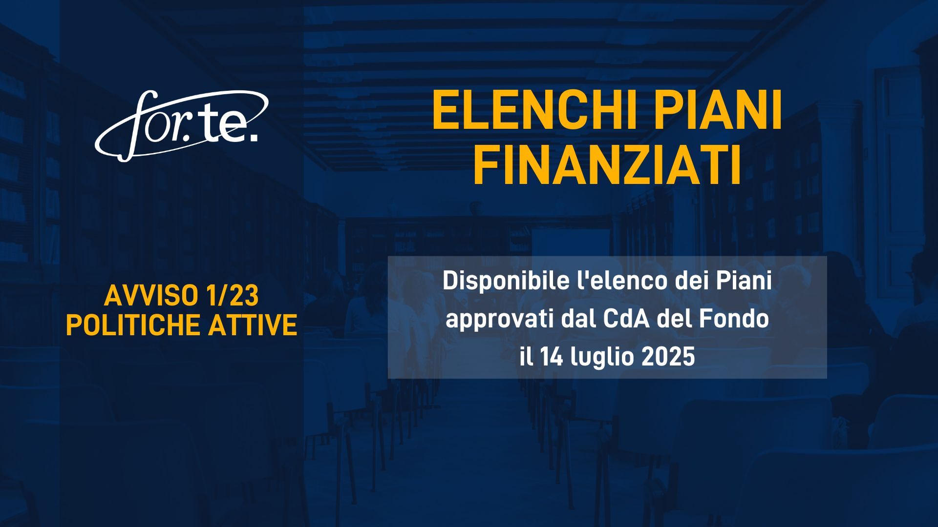 Si informa che nella seduta del CdA del 14 luglio 2025, il Consiglio di Amministrazione ha deliberato gli elenchi dei Piani finanziati relativi all’Avviso 1/23 Politiche attive