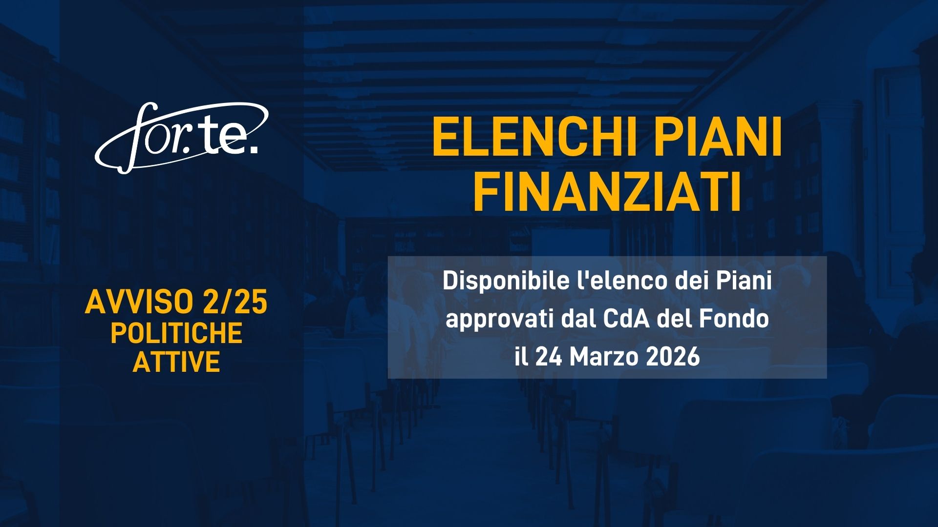 Si informa che nella seduta del CdA del 24 Marzo 2026, il Consiglio di Amministrazione ha deliberato gli elenchi dei Piani finanziati relativi all’Avviso 2/25 Politiche Attive