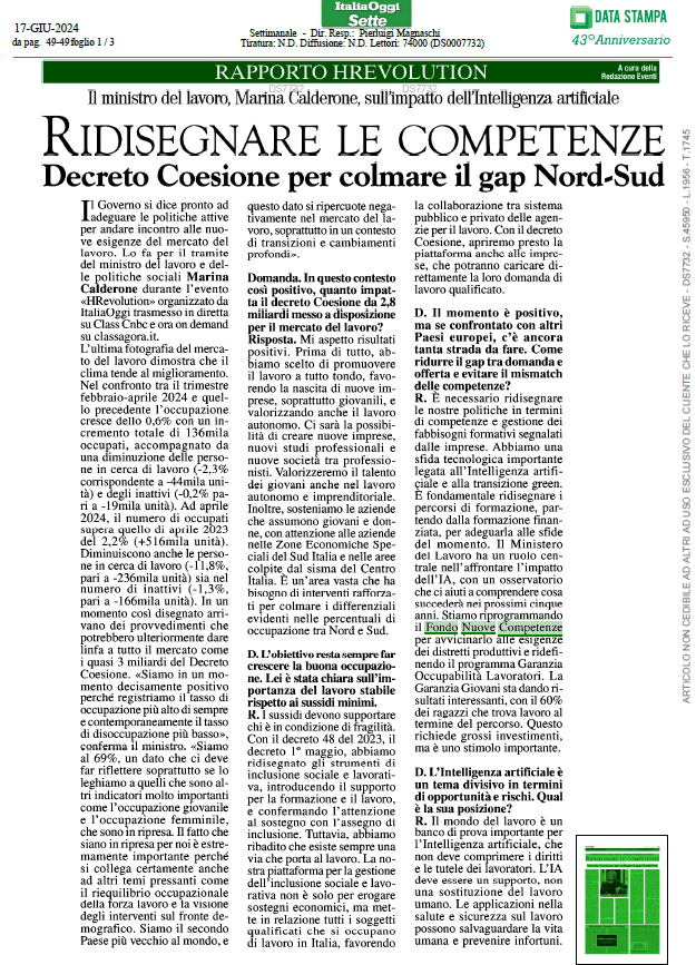• RIDISEGNARE LE COMPETENZE- Italia Oggi- (PDF, 948 KB) – Pubblicato il 17/06/2024